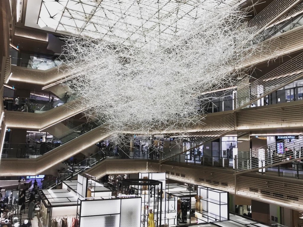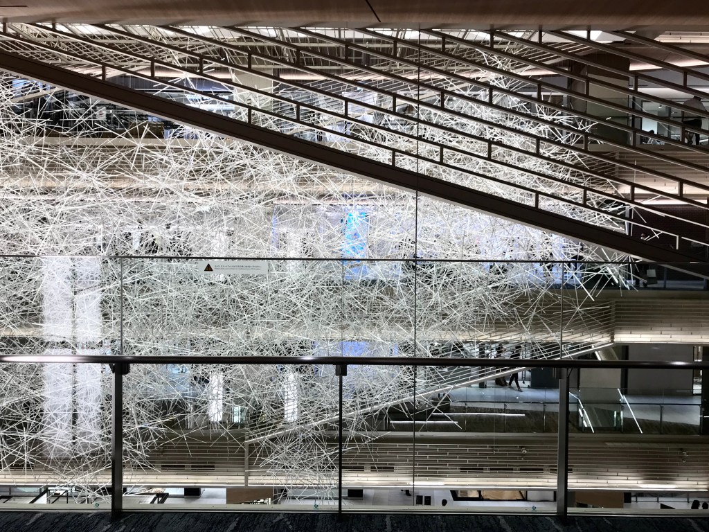 先日より、吉岡徳仁氏が銀座シックスの吹抜ホールに作品を展示したということでさっそく見に行くことにした。そのときの写真がトップと下の画像。