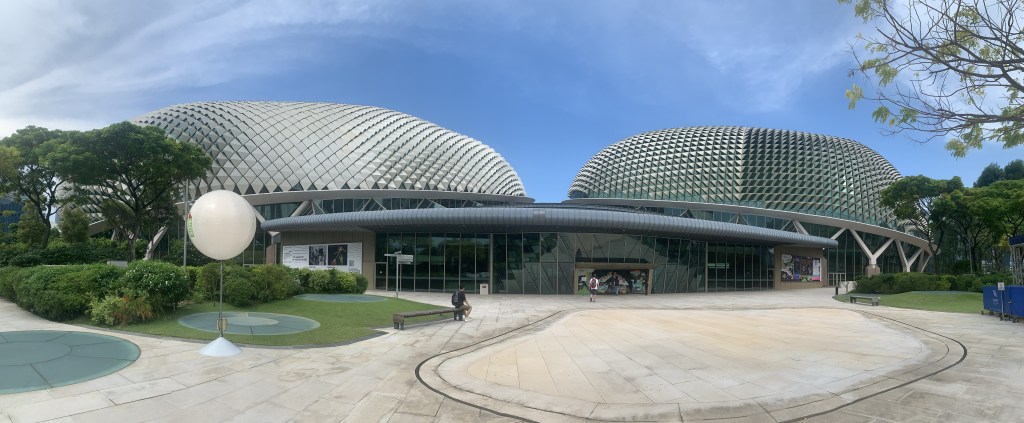 これまた有名な観光名所。ドリアンの愛称で有名なエスプレナード・シアターズ・オン・ザ・ベイ。建物のカタチからドリアンとのことですが、特徴的な屋根の三角のパネルは日射をコントロールして室内の環境負荷を抑えているのだとか。設計段階からシミュレーションを行なって最適な角度を導いていったようです。実際具体的にどれくらいの省エネ効果があったかは分かりませんが、内部は直射日光は遮りつつも全体的に明るく開放的で、とても居心地の良い空間でした。
